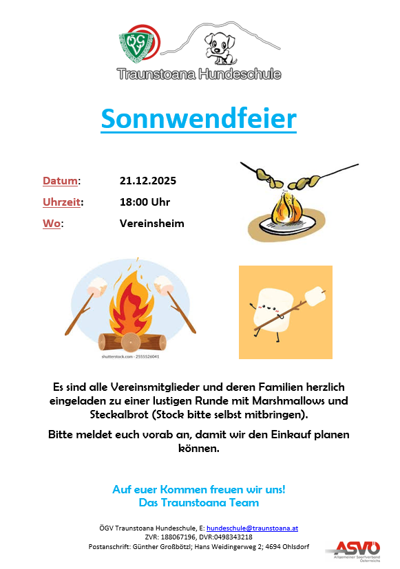!!! Kursbeginn !!! Am 30.08.2025 um 14:00 Uhr ist es wieder so weit. Wir starten nach der Sommerpause mit voller Energie in eine neue Kurssaison. Es werden folgende Kurse angeboten: - Welpen - & Junghundekurs - Begleithundekurs (Unterordnung) - IBGH 1-3 - Breitensport - Rally Obedience - Hoopers Agility Da wir eine begrenzte Teilnehmerzahl in den einzelnen Kursen haben bitten wir Euch, dass ihr Euch so bald wie möglich online auf unserer Homepage Kursanmeldung (traunstoana.at) für den jeweiligen Kurs anmeldet. Wir freuen uns auf Euch! 😊