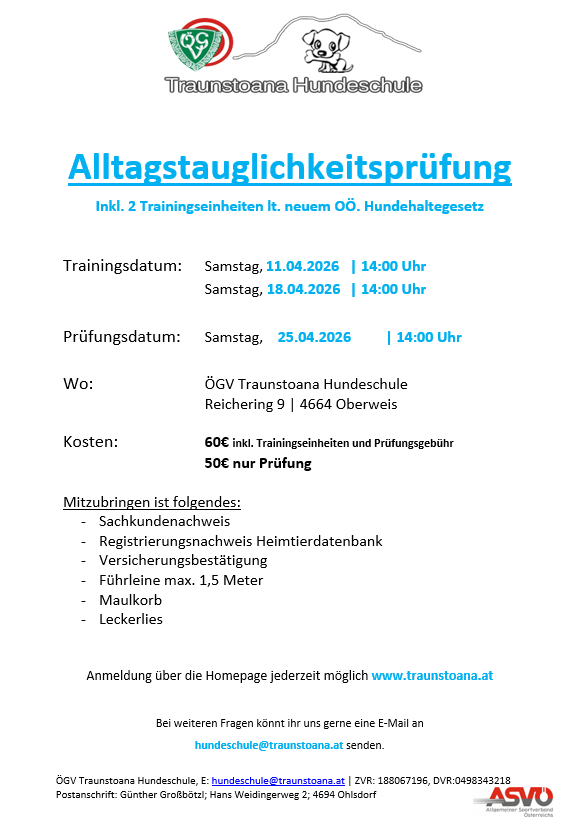 Bist du noch auf der Suche nach einem Termin für die Alltagstauglichkeitsprüfung? Dann bist du bei uns genau richtig! Unsere Alltagstauglichkeitsprüfung findet am Samstag, 25.04.2026 um 14:00 Uhr statt. Damit ihr bestens vorbereitet seid, bieten wir euch davor zwei Trainingseinheiten mit euren Hunden an. So könnt ihr euch sicher und entspannt auf die Prüfung einstellen. Meldet euch ganz einfach über unsere Homepage www.traunstoana.at für die Prüfung an. Wir freuen uns auf euch und bis bald!